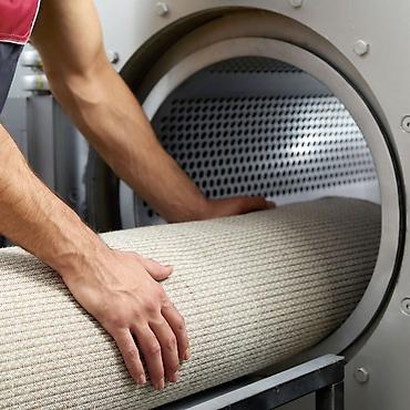 - Полный цикл цеховой обработки на специализированном оборудовании: вибровыбивание/пыливыбивание, автоматическая роторная мойка с шампунированием, экстракция, центрифугирование для глубокой отжима, камерная сушка на подвесной линии с контролем температуры и влажности.