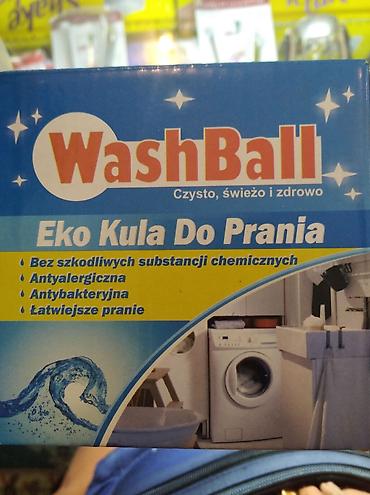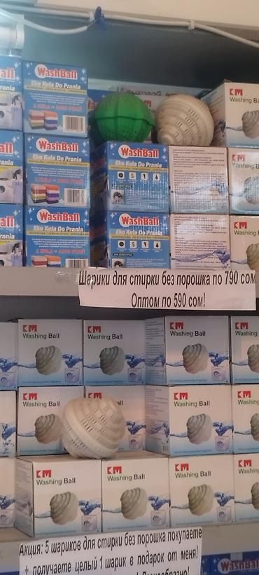 На фотографиях представлены модели: зелёный WashBall и белый KM Washing Ball. На витрине указаны цены: розница 790 сом, оптом 590 сом. Акция: при покупке 5 шариков — 1 шарик в подарок.