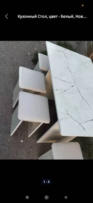 Кухонный комплект: стол + 4 табурета - Состав: прямоугольный стол и четыре табурета-куба. - Материал: ЛДСП/МДФ с светлым мраморным рисунком (глянцевое ламинированное покрытие). - Цвет: белый с сер...