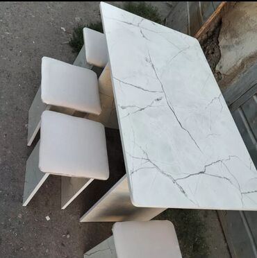 Обеденный комплект в современном стиле: прямоугольный стол и 4 табурета. - Материал: плиты с отделкой под белый мрамор с серыми прожилками. - Цвет: белый «мрамор», матово‑гладкая поверхность. - Со...
