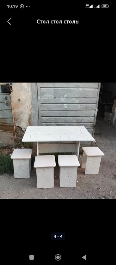 Комплект обеденной мебели: стол + 4 табурета. - Стол прямоугольный, со скруглёнными углами. - Две сменные или разные столешницы на фото: глянцевая белая и под белый мрамор с серыми прожилками. - О...