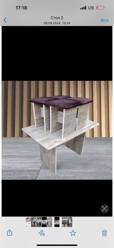 Дизайнерский комплект для зала: стол и два табурета/пуфа. - Материал: плиты под камень/керамогранит с мраморной текстурой, кромки со светлым кантом. - Конструкция: стол с крестовидной опорой и ква...