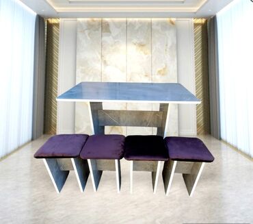 Комплект обеденного стола в современном стиле. Состав: - Обеденный стол с оригинальной геометрической опорой. - Четыре табурета с мягкими подушками сидений. Материалы и дизайн: - Столешница и опо...