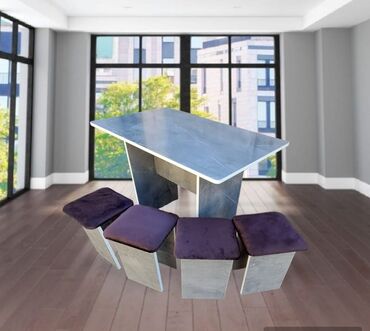 Кухонный обеденный комплект: стол + 4 пуфа - Стол прямоугольной формы с закруглёнными углами. - Столешница с рисунком «белый мрамор», гладкая, легко очищается. - Основание стола в едином стиле с д...