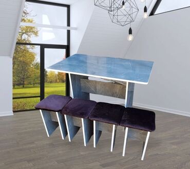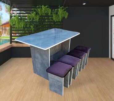 Обеденный комплект стол + табуреты - Комплект: прямоугольный стол и 4 табурета. - Материал: ЛДСП с имитацией камня/мрамора, кромки обработаны. - Столешница прямоугольная, устойчивая опора-тумба. -...