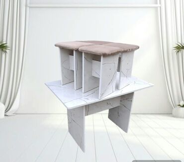 Кухонный комплект: стол + 4 табурета - Состав: прямоугольный стол и четыре табурета-куба. - Материал: ЛДСП/МДФ с светлым мраморным рисунком (глянцевое ламинированное покрытие). - Цвет: белый с сер...