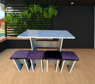 Кухонный обеденный комплект: стол + 4 пуфа - Стол прямоугольной формы с закруглёнными углами. - Столешница с рисунком «белый мрамор», гладкая, легко очищается. - Основание стола в едином стиле с д...