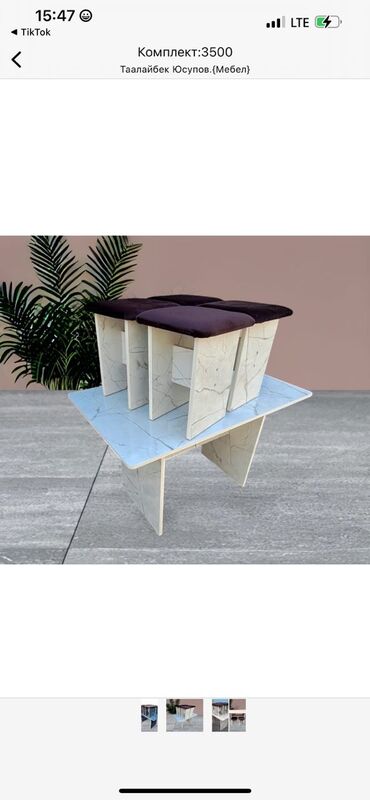 Дизайнерский комплект для зала: стол и два табурета/пуфа. - Материал: плиты под камень/керамогранит с мраморной текстурой, кромки со светлым кантом. - Конструкция: стол с крестовидной опорой и ква...