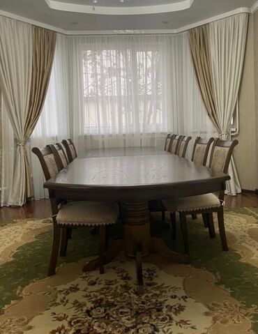 Обеденный гарнитур в классическом стиле: большой раздвижной стол 3.5 м. + 14стульев + две скатерти. - Стол овально‑прямоугольной формы, массив с декоративной резьбой и инкрустацией по кромке стол...