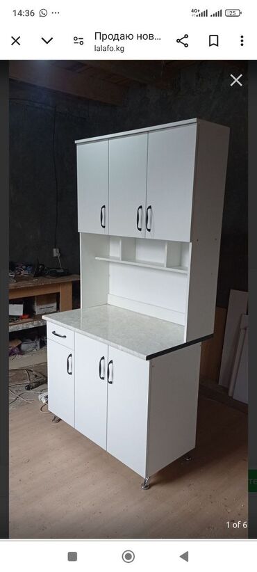 Кухонный буфет/шкаф со столешницей - Цвет: белый, лаконичный дизайн под современную кухню - Конструкция: двухъярусная - Верхний модуль: три распашные двери с ручками, внутри полки для посуды и п...