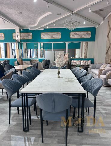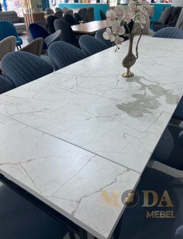 Обеденная группа: стол + 8 стульев - Стол прямоугольный, столешница под мрамор (светло-серый рисунок), скруглённые углы. Опоры металлические, окраска белая. - 8 стульев на металлическом каркасе (б...