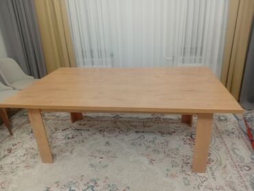 Большой прямоугольный стол из светлого дерева/ЛДСП с натуральной текстурой. Лаконичный современный дизайн: толстая столешница на массивных прямых опорах по углам — конструкция обеспечивает высокую устойчивость. Универсальный нейтральный оттенок под дуб легко сочетается с разными интерьерами.