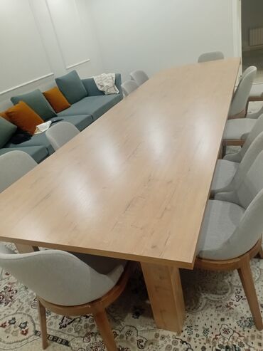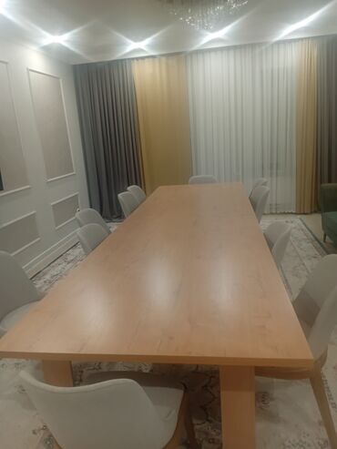 - просторная столешница (визуально около 90–100 см шириной, длина — значительно больше стандартной, рассчитана на 8–12 посадочных мест);