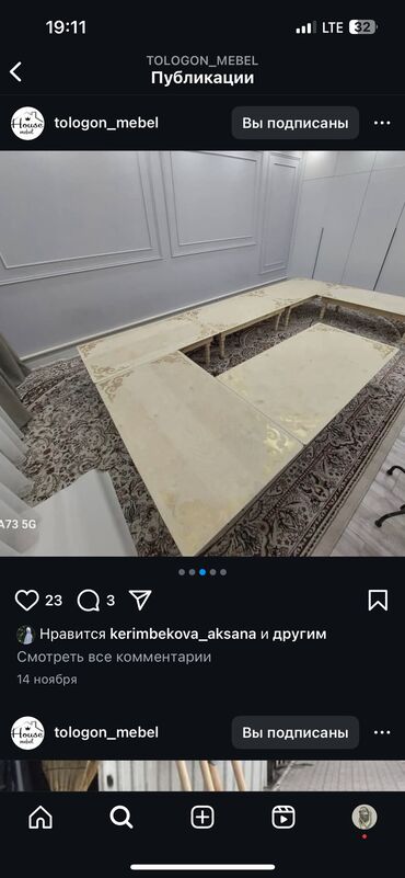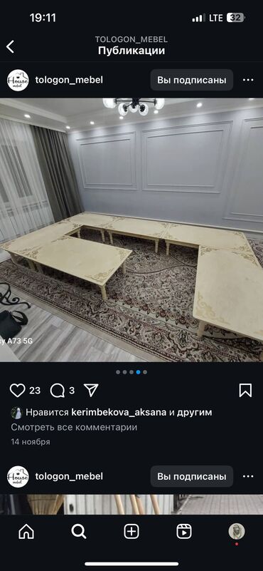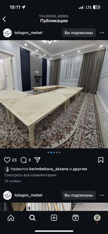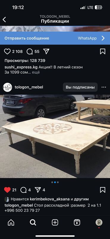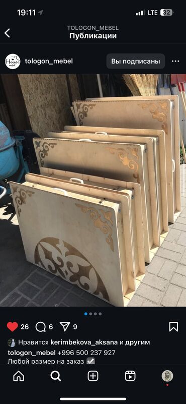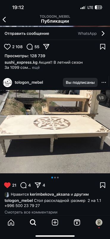 "Буктолмо кыргыз стол". Баалары: 1м×1м = 3500с 1.5м×1м=4000с 2м×1м=5000с 3м×1.1м=6000с узун буттуу столдор: 2×1.1=9000с 3×1.1=10000с. арнамент +1000с сиз каалаган размерде да жасап беребиз .