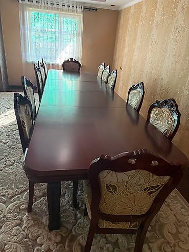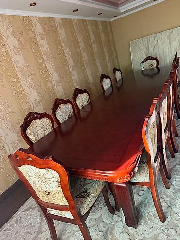 Продаем комплект гостиного стола со стульями. НАТУРАЛЬНОЕ ДЕРЕВО !!! Очень добротный, благородный и массивный раскладной стол, стулья 14шт сделаны из дерева. Сшиты чехлы на стулья. Состояние новое!...