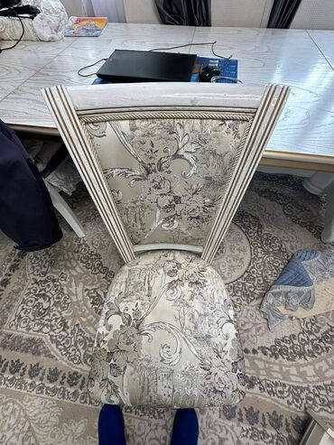 Стол в отличном состоянии б/у с 12 стульями с обивкой из жаккардовой ткани.