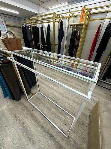 Торговая стойка с белым металлическим каркасом и прозрачной стеклянной столешницей. Конструкция обеспечивает демонстрацию товаров на уровне глаз и дополнительное пространство для хранения в нижней части. Подходит для использования в магазинах одежды и аксессуаров.