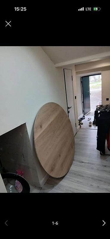 - Круглая столешница под обеденный/журнальный стол: натуральный шпон/массив с выраженной текстурой древесины, диаметр визуально крупный. Поверхность ровная, подготовлена под финиш.