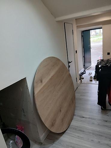 - Столешница круглая из массива (вид натурального дуба): крупная круглая плита со спокойной древесной текстурой, склейка ламелей, подходит под обеденный/журнальный стол. Кромка ровная, готова к дальнейшей обработке и установке на опору.