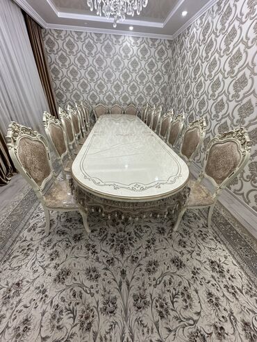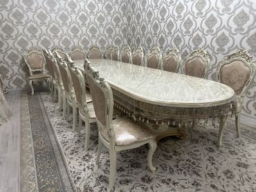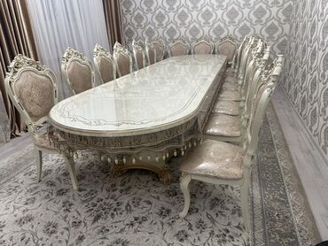 Элегантный обеденный гарнитур в классическом стиле. 14 стулу менен стол сатылат. сентябрь айында 135000сомго алынган. Жер уйдон квартирага кочуп жатканыбызга байланыштуу сатылат. Баасы 90000сом.