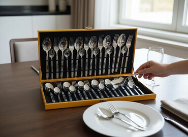 - В составе: столовые ложки, вилки, ножи, чайные/кофейные ложки, десертные ложки (видно в двух уровнях кейса)