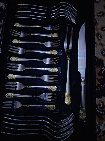 - Материал приборов: нержавеющая сталь с декоративными позолоченными вставками/накладками на рукоятях (классический узор).