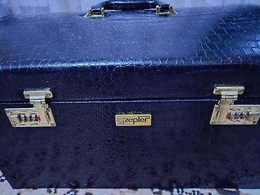 - Чемодан: тёмный под «кроко», металлическая фурнитура золотистого цвета, два кодовых замка, эмблема Zepter на передней панели. Внутри — мягкая бархатистая отделка и логотип.