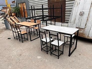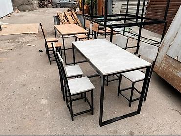 - Комплекты со стульями: спинка и сиденье из той же плиты, чёрная металлоконструкция.