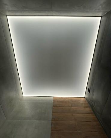 Натяжные потолки с дизайнерской подсветкой - Проектирование и монтаж натяжных потолков под ключ: одноуровневые, парящие линии по периметру, встроенные линейные светильники, теневой профиль без вид...