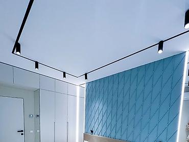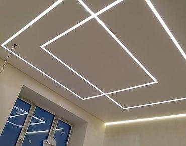 Натяжные потолки с дизайнерской подсветкой - Проектирование и монтаж натяжных потолков под ключ: одноуровневые, парящие линии по периметру, встроенные линейные светильники, теневой профиль без вид...