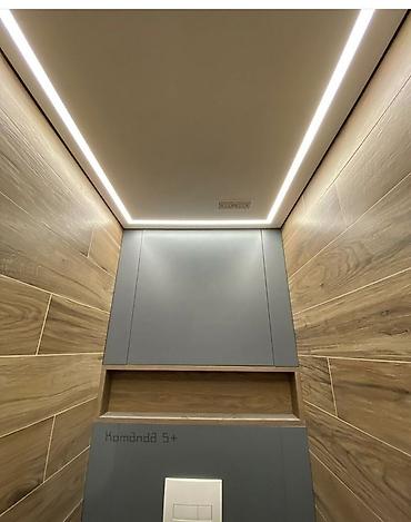 Натяжные потолки с дизайнерской подсветкой - Проектирование и монтаж натяжных потолков под ключ: одноуровневые, парящие линии по периметру, встроенные линейные светильники, теневой профиль без вид...
