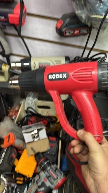 Бренды на фото: ATEC (бежевый) и RODEX (красный). Сетевые, с рукоятью-пистолетом, металлическая насадка-сопло, боковые вентиляционные решётки для охлаждения. Подходят для: