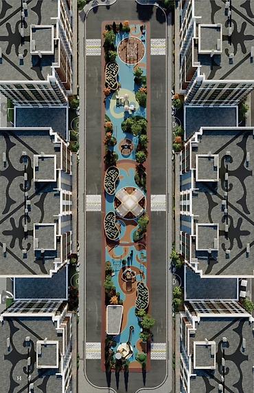 - Концепция «жилой бульвар»: ландшафтный парк во внутреннем дворе, прогулочные аллеи, декоративный водный канал, детские зоны.