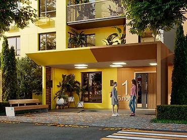- Современные подъезды с навесами, витражным остеклением и зоной ожидания.