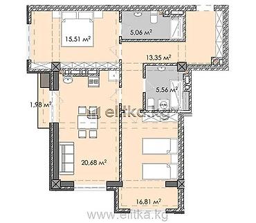Просторная 2-комнатная квартира в современном жилом комплексе Башат. Планировка и метраж: - Гостиная — 21,31 м² - Кухня-столовая — 17,03 м² - Спальня — 16,34 м² - Прихожая — 8,80 м² - Санузел — 4,...