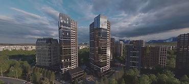 - Две высотные башни со смелой каскадной пластикой фасадов, витражным стеклом и акцентной подсветкой.