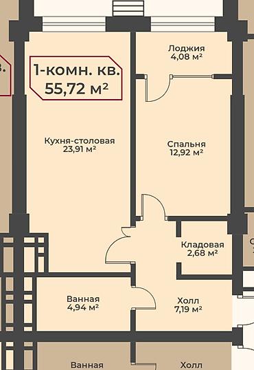 Функциональные зоны по плану: кухня‑столовая 23,91 м², спальня 12,92 м², холл 7,19 м², кладовая 2,68 м², ванная 4,94 м², лоджия 4,08 м²