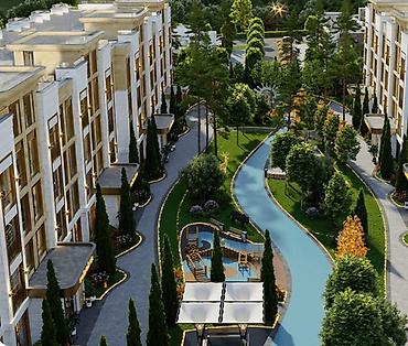- Благоустроенная закрытая территория: прогулочные аллеи, озеленение, декоративный водный канал, зоны отдыха и детские площадки
