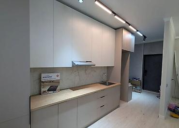 - Кухонная зона: линейный гарнитур с верхними и нижними шкафами, варочная панель, вытяжка, мойка, рабочая поверхность из столешницы под дерево, фартук под мрамор