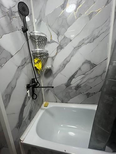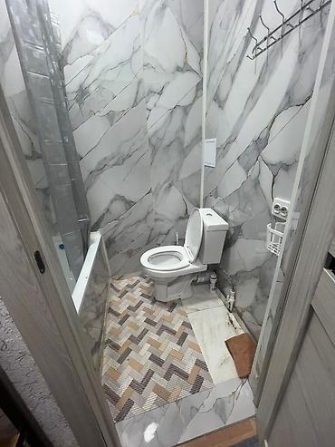 - Санузел совмещённый: ванна с ширмой, унитаз, стены облицованы крупноформатной плиткой под мрамор, на полу керамическая плитка.