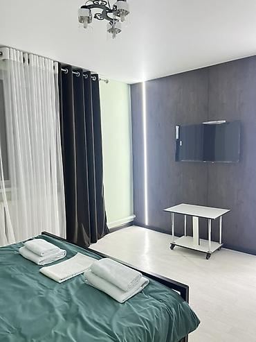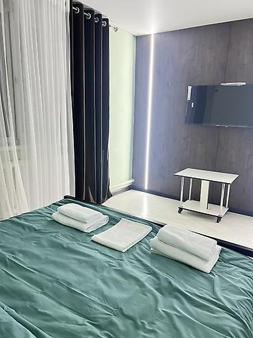 - Комната с двуспальной кроватью, комплектами постельного белья и полотенцами. На стене — плоский телевизор, декоративная панель и вертикальная светодиодная подсветка. Портальные шторы + тюль на окне.