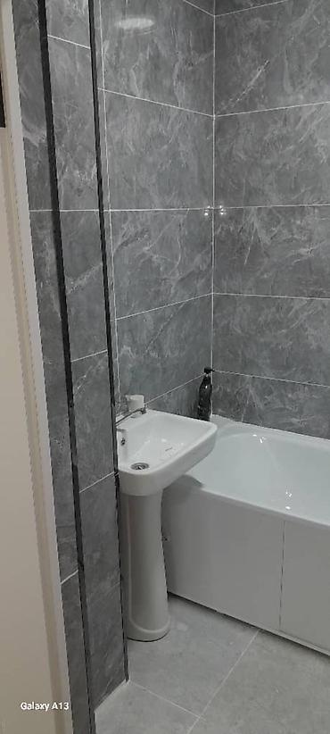 - Ванная комната в серой керамогранитной плитке «под мрамор».