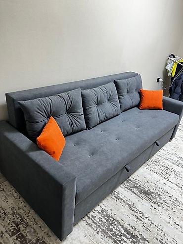 - Раскладной диван темно‑серого цвета с тремя подушками и двумя декоративными ярко‑оранжевыми подушками, есть ниша/петли для выкатного механизма.