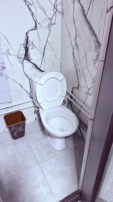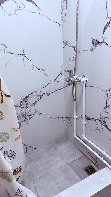 - Санузел: раздельный блок с душевой зоной (плитка на полу, панели/плитка под мрамор на стенах, трап для стока, смеситель с лейкой) и туалетом.