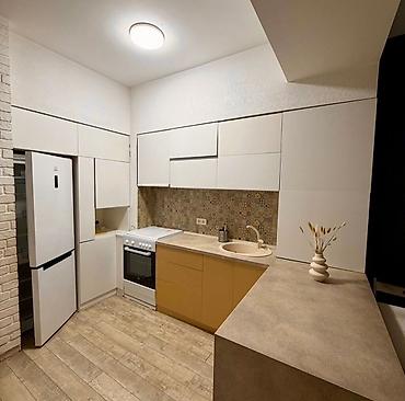 - Кухня линейной планировки с удобной барной/обеденной стойкой: холодильник, духовой шкаф, варочная панель, вытяжка, мойка; достаточное количество систем хранения, фартук с узорной плиткой.
