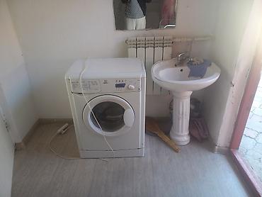 - Отдельная зона с раковиной на пьедестале, зеркалом, радиатором и стиральной машиной Indesit с фронтальной загрузкой и электронным управлением.