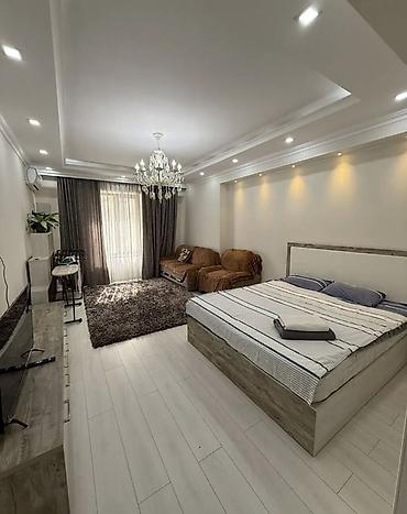 - Большая спальня-гостиная: двуспальная кровать с высоким изголовьем, комплект постельного белья и полотенца, диван-зона отдыха, кофейный столик, ковёр, ТВ на тумбе, кондиционер. Многоуровневые потолки с точечным и центральным освещением, плотные шторы на панорамном выходе к балкону/лоджии.