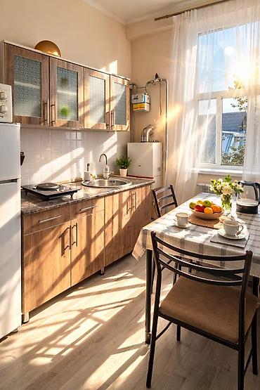 - Кухонная зона с полноценным гарнитуром, мойкой, рабочей столешницей, верхними и нижними шкафами.