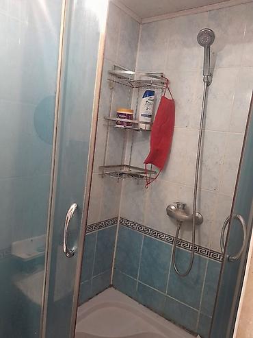 - Санузел с душевой кабиной: раздвижные стеклянные двери, ручной душ, полочки для принадлежностей, плитка на стенах.