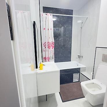 - Санузел: ванна с душем, шторка, подвесной унитаз с инсталляцией, навесная тумба с раковиной, большое зеркало, ниши под хранение, комбинированная отделка плиткой под мрамор и темным камнем.